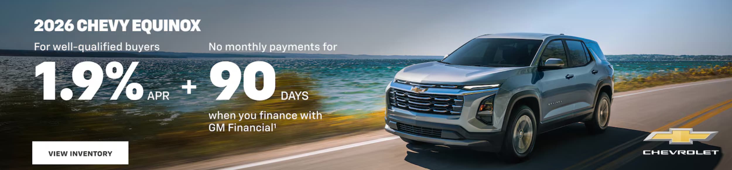 (1) Finance charges accrue from date of financing. Deferred monthly payments for 90 days. 1.9% APR for 36 months. Monthly payment is $28.60 for every $1,000 you finance. Example down payment: 14.5 %. Must finance with GM Financial. Not available in PA. Some customers may not qualify. Not available with lease and some other offers. Take new retail delivery 11/03/25.