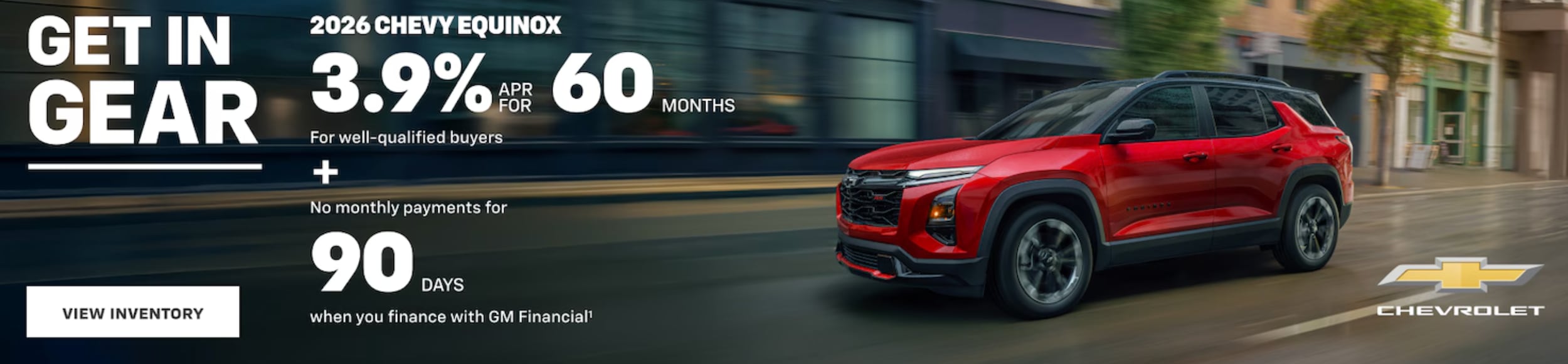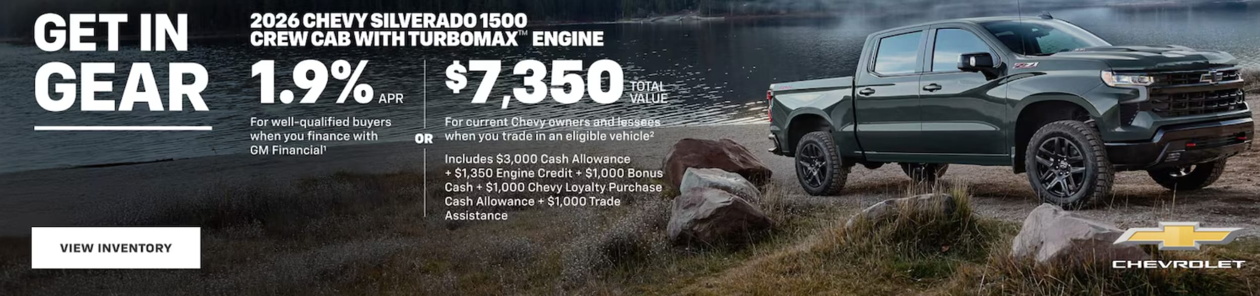 2. Available on the TurboMaxâ„¢ engine only. Must trade in a 2012 model year or newer vehicle. Must show proof of current lease of a 2021 model year or newer Chevy vehicle or be a current owner of a 2012 model year or newer Chevy vehicle for at least 30 days prior to the new vehicle sale. Not available with lease and some other offers. Residency restrictions apply. Take new retail delivery by 3/2/26.Disclaimer: 1. Finance charges accrue from date of financing. Deferred monthly payments for 90 days. Monthly payment is $18.37 for every $1,000 you finance. Example down payment: 16.8%. Must finance with GM Financial. Down payment required at signing, if applicable. Not available in PA. Some customers may not qualify. Not available with lease and some other offers. Take new retail delivery 3/2/26.