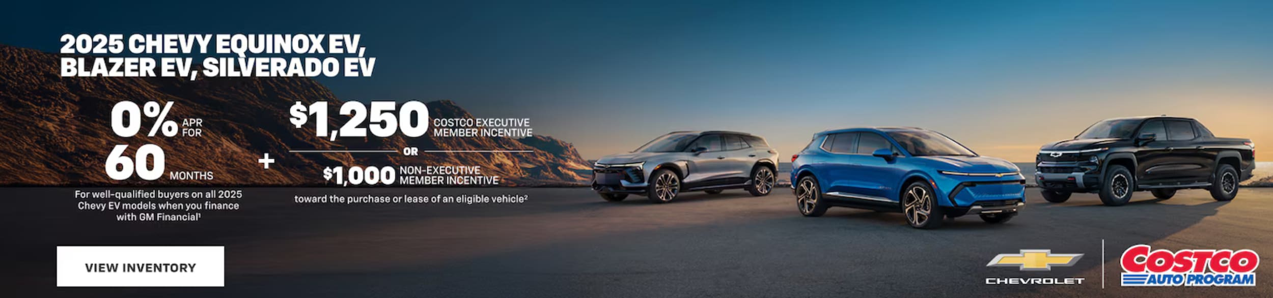 (2) To qualify for the GM Limited-Time Special, you must: (1) be a current Costco Gold Star, Business, or Executive level Member by September 30, 2025; (2) register with Costco Auto Program online or through its call center by January 2, 2026, to receive a certificate with your unique promotion code; (3) present your certificate and unique promotion code to any Chevrolet dealer at time of visit; (4a) take delivery between October 1, 2025, and January 2, 2026, of a new 2024, 2025, 2026 Chevrolet Blazer EV, Equinox EV, Silverado EV to receive a $1,000 Gold Star/Business Membership Costco member-only incentive or $1,250 Executive level Membership Costco member-only incentive; (4b) take delivery between October 1, 2025, and January 2, 2026, of a new 2025, 2026 Chevrolet BrightDrop 400, BrightDrop 600 to receive a $2,750 Gold Star/Business Membership Costco member-only incentive or $3,000 Executive level Membership Costco member-only incentive. Incentive will be applied at time of eligible purchase or lease and is compatible with current eligible manufacturer incentives for which you qualify. Incentive is subject to change due to vehicle inventory availability. Visit CostcoAuto.com/GM for full details. Costco and its affiliates do not sell automobiles or negotiate individual transactions.
